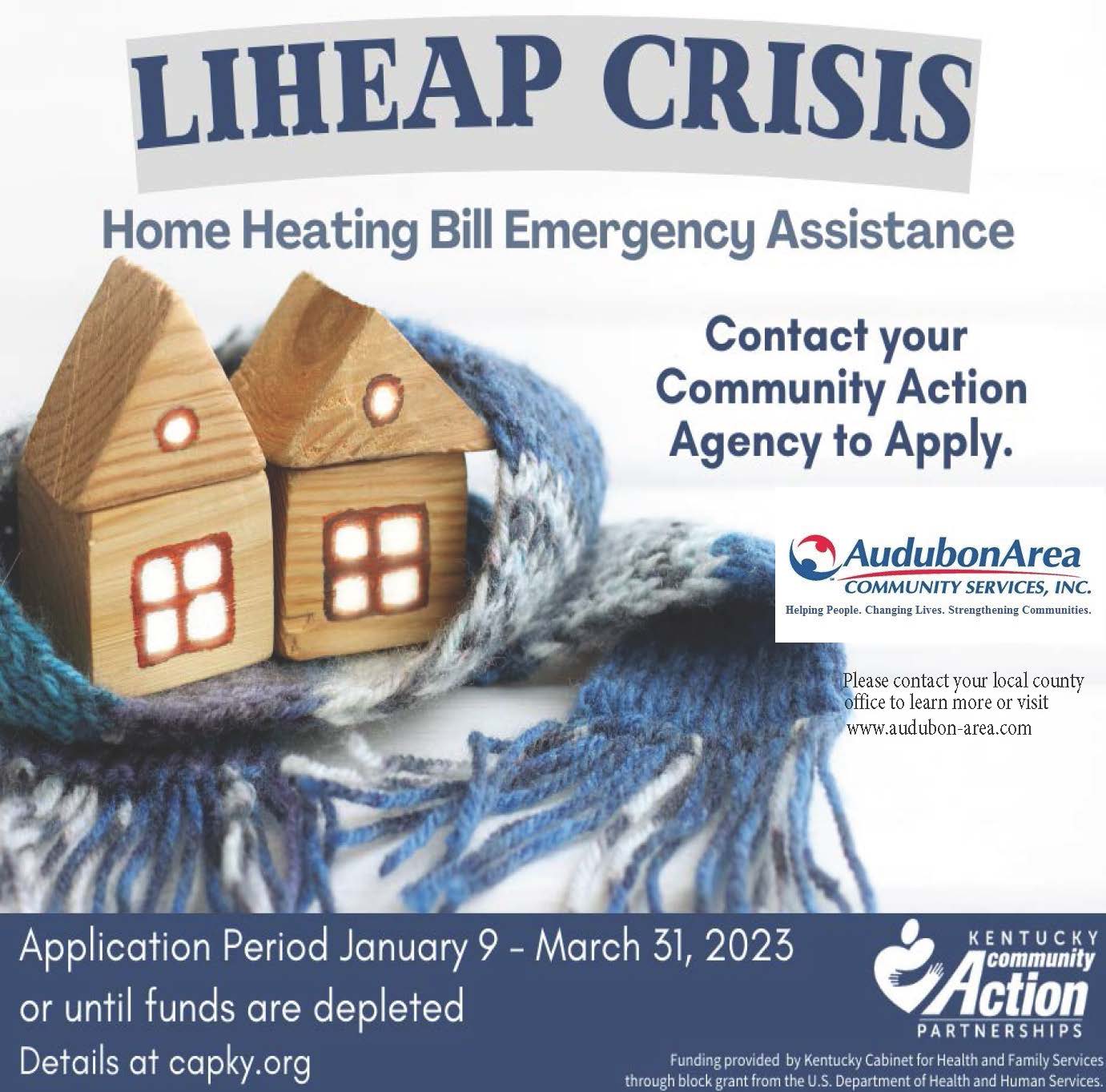 This project is funded, in part, under a contract with the Cabinet for Health and Family Services with funds from the Community Services Block Grant Act of the U.S. Department of Health and Human Services. Audubon Area Community Services will not discriminate against anyone applying for or receiving assistance or services based on race, religion, color, national origin, sex, disability, age, political beliefs or reprisal or retaliation for prior civil rights activity or any other protected class identified in federal, state or local laws.
